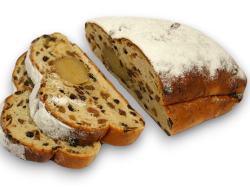 Stol gevuld met rozijnen en amandelspijs. Gedecoreerd met poedersuiker. Verpakt in stoldoos.